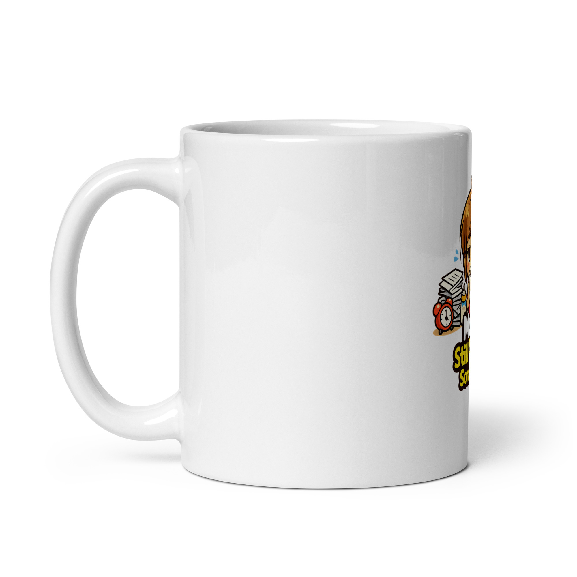 This design reflects a familiar situation: early mornings, late nights, and everything in between, often running on limited rest but full responsibility. Whether it’s caring for young children, managing a household, or balancing multiple roles at once, staying “somehow awake” becomes less of a surprise and more of a standard operating mode. This mug turns that experience into something visible, with a tone that’s relatable rather than exaggerated.